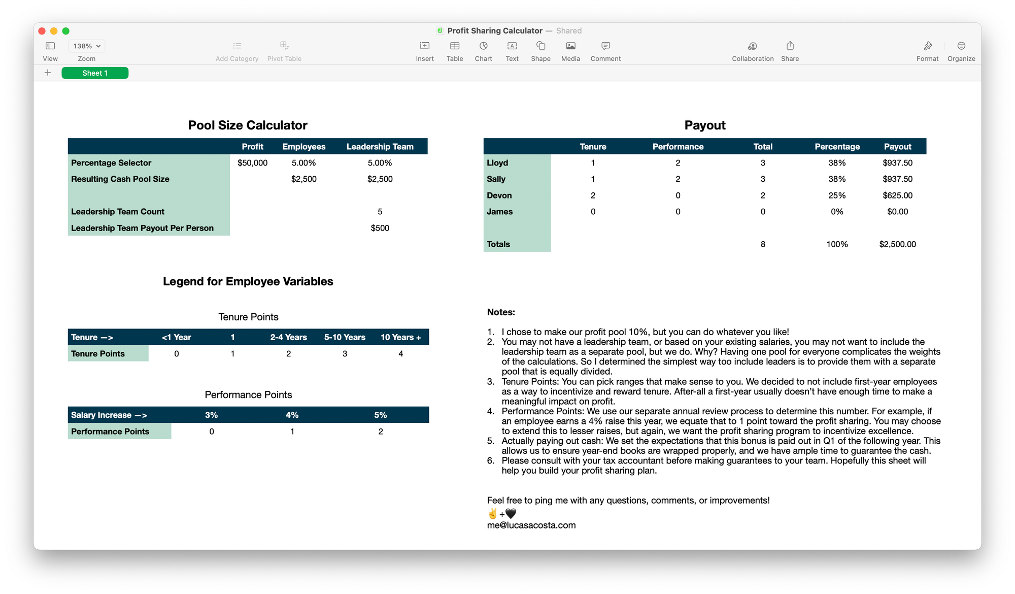 So I want to share the spreadsheet hoping it will help you implement a profit sharing program for your team. Your team is what makes your company possible, and I think profit sharing is a great way to materialize your gratitude to your team's effort.
